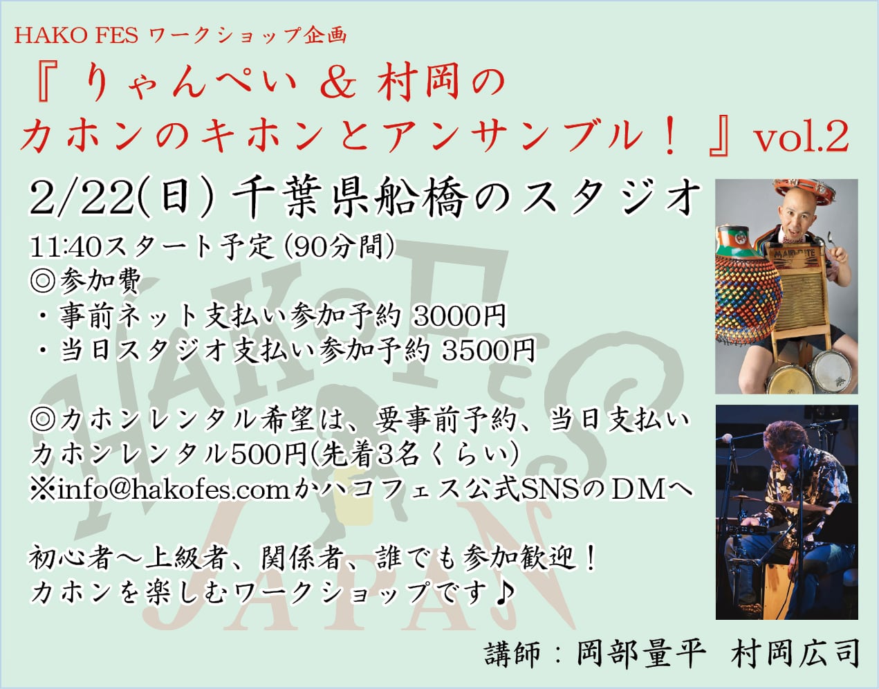 【ワークショップ】2/22(日)『 りゃんぺい & 村岡の カホンのキホンとアンサンブル!』vol.2